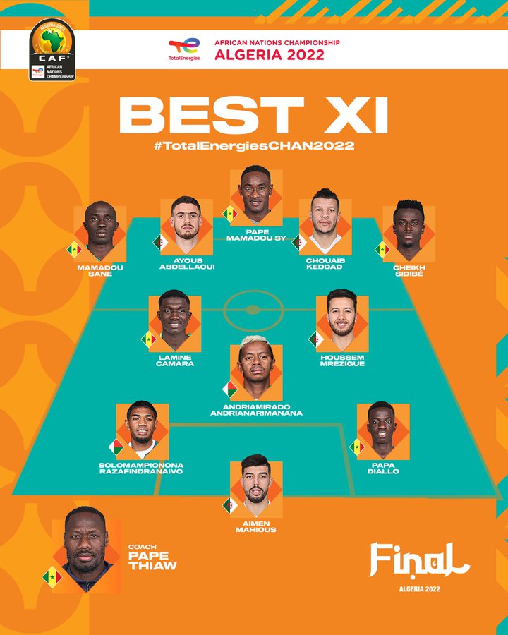 Quatre joueurs algériens et sénégalais, ainsi que deux malgaches, composent cette formation organisée en 4-3-3. Les Verts sont représentés par les défenseurs Ayoub Abdellaoui (MC Alger) et Chouaïb Keddad (CR Belouizdad), du milieu de terrain Houssem Mrezigue (CR Belouizdad), élu meilleur joueur du tournoi, et de l’attaquant Aymen Mahious (USM Alger), qui a terminé meilleur buteur de ce CHAN 2022 avec cinq réalisations.