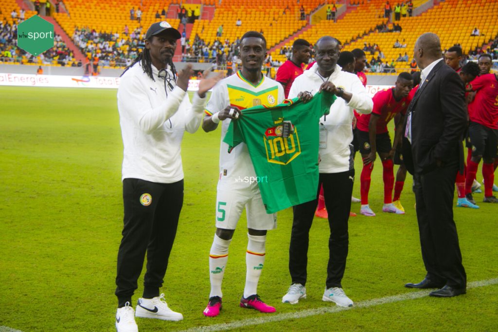 Avant le début du match Sénégal/ Mozambique d’hier, la Fédération Sénégalaise de Football, via le directeur technique national, Mayacine Mar a donné un maillot floqué du numéro 100 à Gana Gueye.