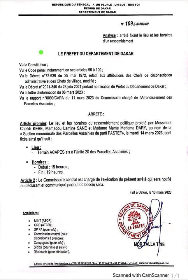 L’arrêté préfectoral autorisant le rassemblement de Yewwi vient d’être rendu public Laisser un commentaire / À la une / Par TIKTOK GALSEN / 14/03/2023 Partagez