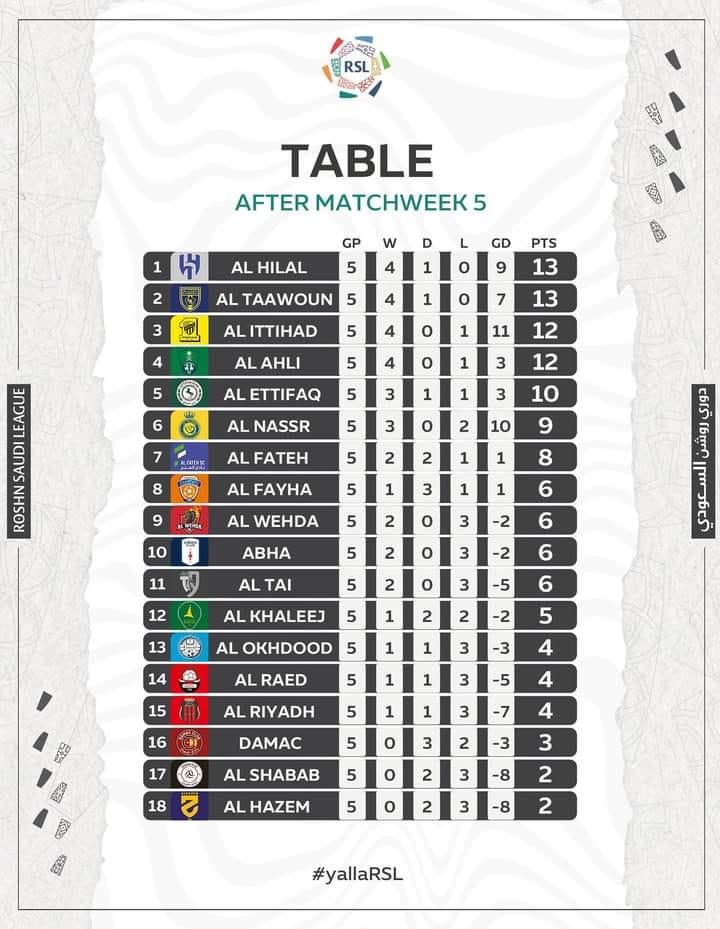 Saudi Pro League: Voici le classement après de cette 5e journée en Al Nassr de Sadio Mané et Cristiano Ronaldo occupe… Laisser un commentaire / À la une, Sports / Par TIKTOK GALSEN / 03/09/2023 Partagez Al Nassr de Sadio Mané et Cristiano Ronaldo occupe la 6e place avec 9pts à 4 longueur du premier Al Hilal qui compte 13pts
